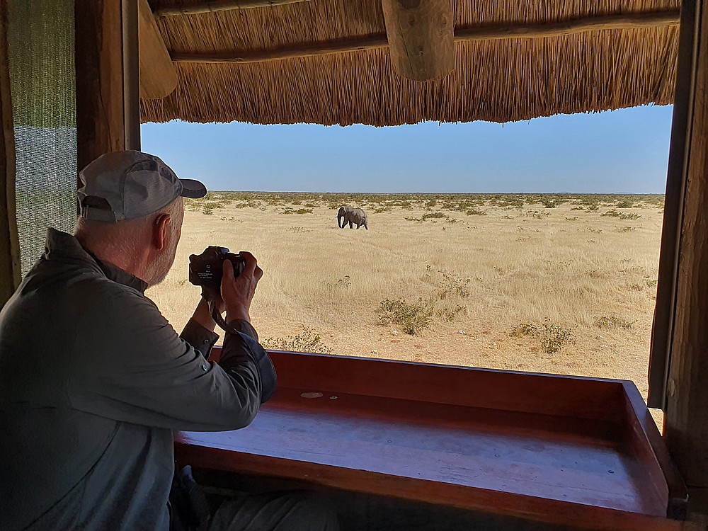 At Olifantrus, on the other hand, we get a few meters close to a large elephant at the water hole in the camp. A tall tower has been built by the hole, and the elephant stands right next to the tower and drinks. Fascinating to see the large wrinkled animal up close.