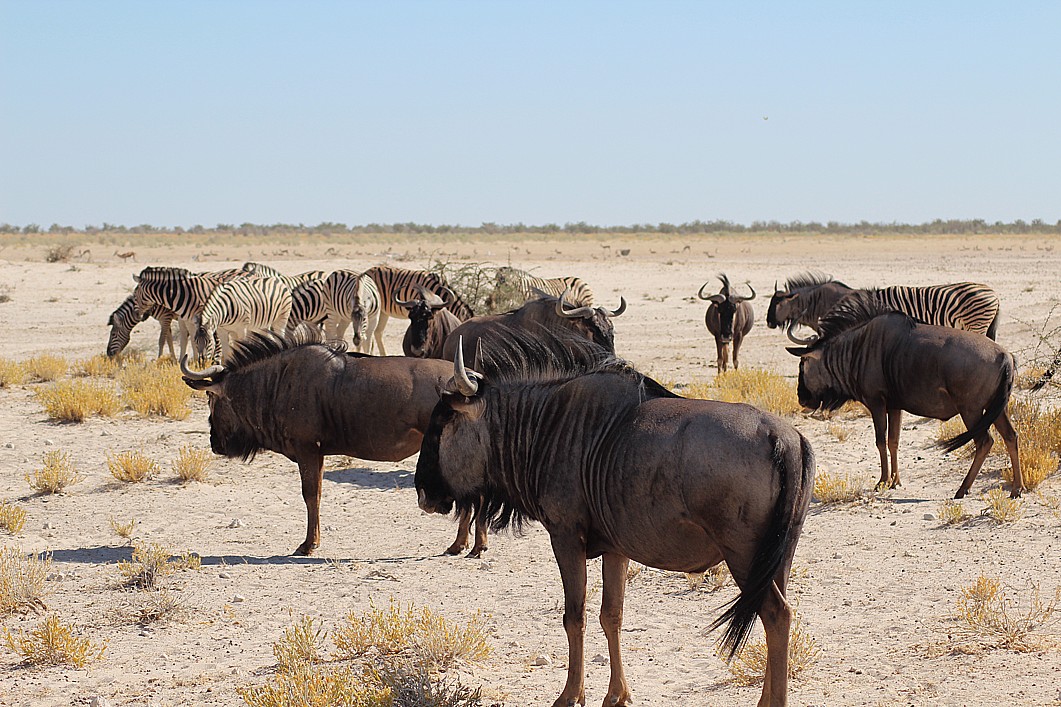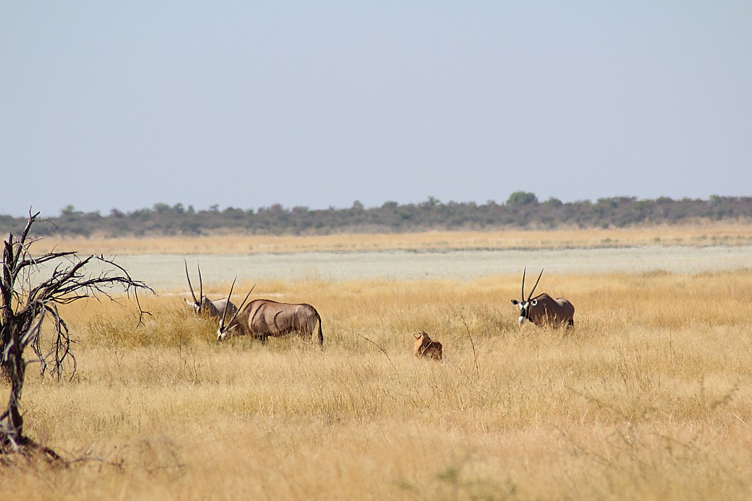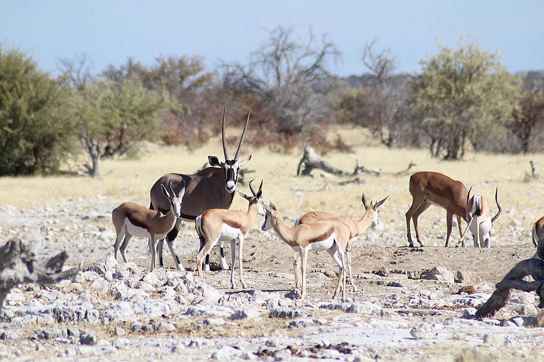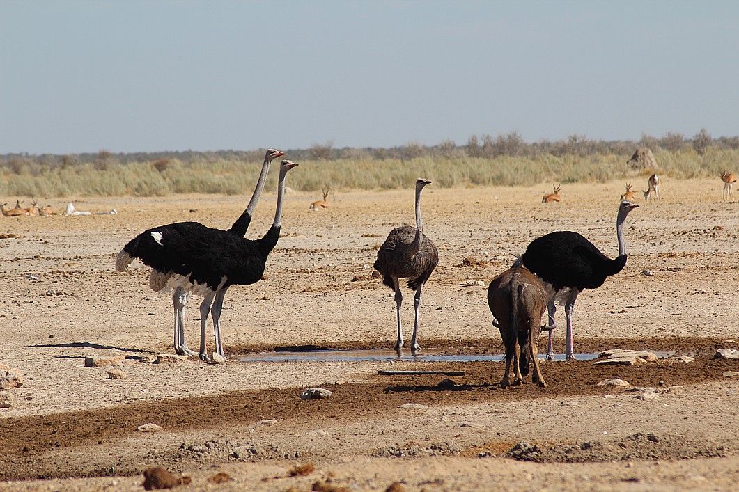 The water holes absolutely fulfilled our expectations. We saw a lot of antelopes, Springbok and Oryx, and buffaloes. Two elephants also stood and drank at the last water hole. You have a hope of seeing lions, but they only come to the water holes at night. All camps are located by water holes so you can go there at night. They are illuminated with red lights that do not disturb the animals. At Namutoni it was mostly antelopes and buffaloes.