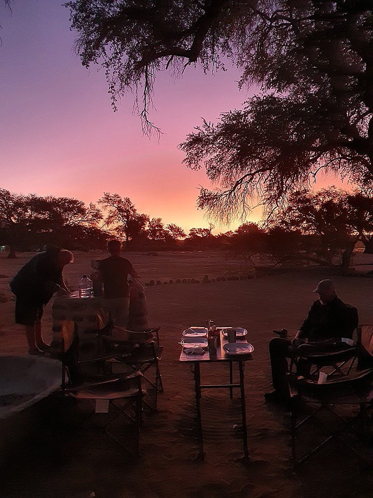 The Erongo Mountains are a relatively large mountain area with great hiking opportunities. We had set out for a camp up in the mountains, but eventually realized that we would not reach it until dark. Instead, we turned onto Camp Mara. A very bumpy road led us to a small farm down to the river bank. No sign of life except for two dogs that came running. Eventually we found an open door and were greeted by an incredibly nice lady who said we would love to camp there. She also had a well-stocked fridge with both beer and wine. This was well received. It was Saturday and alcohol sales stopped at one o’clock we had recently found out. The sundowner was in danger! For overlanders, the beer when arriving at a camp is a sacred institution. As soon as the table and chairs are unpacked, we sit back contentedly with a sundowner in hand, tired after many miles on dusty roads.