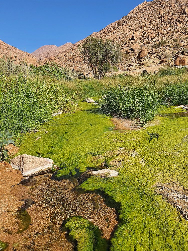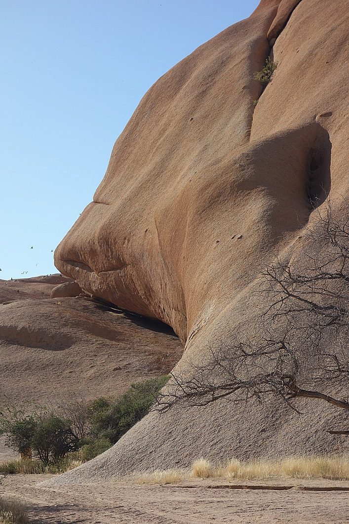 It’s an hour’s hike up to The White Lady. The trip goes up a valley in a dried up river bed. Quite easy to walk, but a little crawling over large rocks. It is hot, around 30 degrees and scorching sun. The valley is dry, but here and there water trickles out in the dry riverbed and makes small bright green oases. The guide says that they do not get paid, so it is only tips from the tourists they live off. There are 12 guides. Now in June there are maybe 20 trips in one day, in the high season 100. So each guide gets only one, or at best two trips per day. We give him 300 NAD in tips. Do not know if this is a lot or a little? He wants us to send him old clothes when we get home, and we get his address.