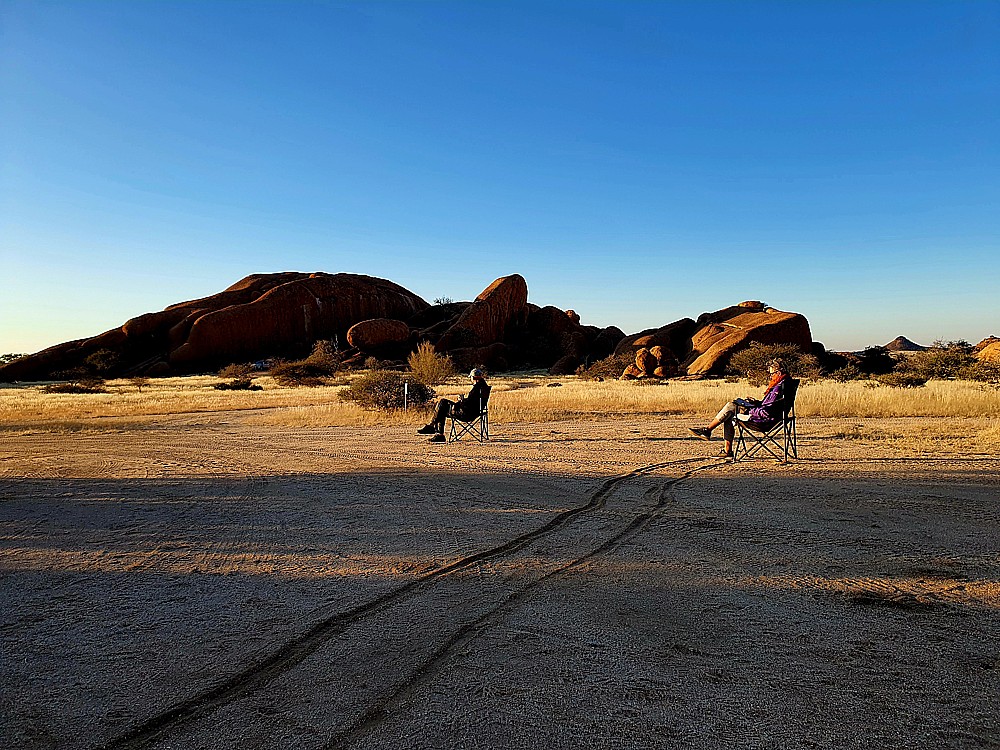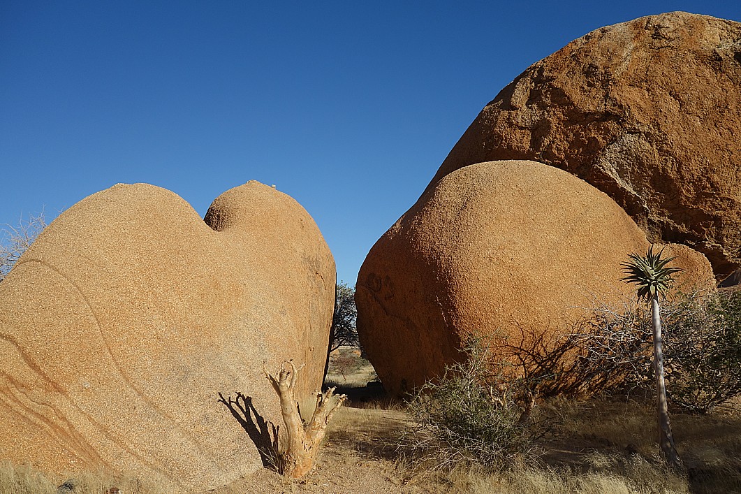 Everyone we have talked to has recommended stopping by Spitzkoppe. The mountain Spitzkoppe is called the Matterhorn of Africa where it rises pointedly and majestically over the open plain landscape. Spitzkoppe is not just a mountain, but a small mountainous area with almost organically rounded boulders of different heights. The boulders are sprinkled with huge marble-like pebbles that at every moment seem to want to roll down.