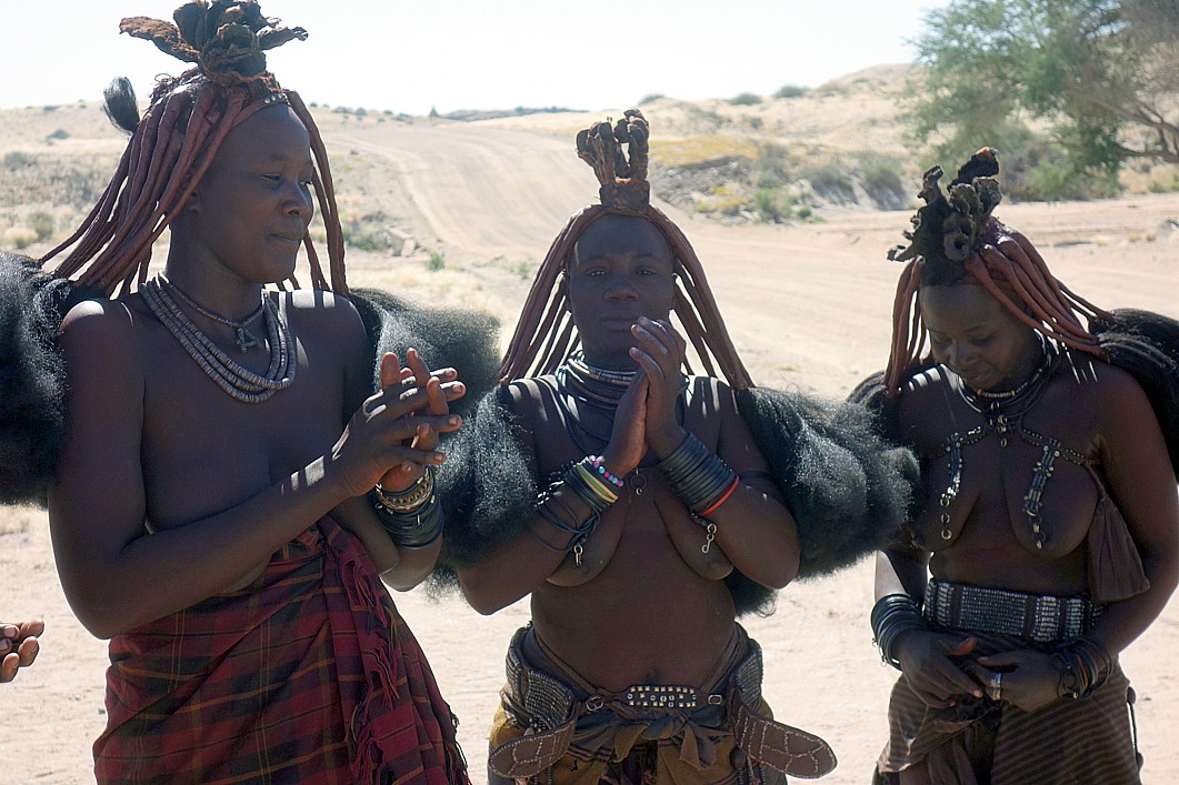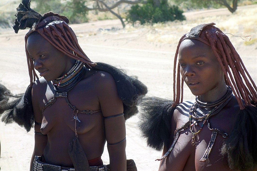 It turned out that we had stopped at a Himba camp, we found out after a bit of googling. The Himba are a semi-nomadic people living in northern Namibia, Kaokoland and Damaraland. They live of cattle and move once in a while. And they refuse to embrace modern times and live in the traditional way. So they do not stand up for tourists, but go dressed like this in everyday life. Their society is a matriarchy where women arrange all the practicalities, while men look after cattle, and in ancient times were warriors. But, as we read at a museum which we later visited in Swakopmund, their culture is under pressure from modern society where children are influenced through the school system.